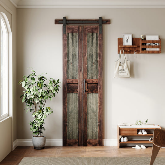 Rustic Dark Two-Tone Pine Wood No Assembly Required Bifold Sliding Barn Door with Hardware Kit