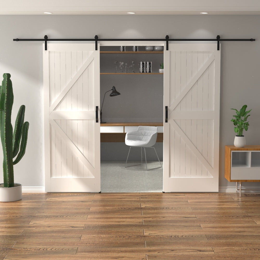 - 8FT Double door including 2 pieces 4FT sliding track, 4-door stoppers, 4-wall hangers with rollers, 1-floor guide,1 junction plate, 4-anti-jump disks,8 large bolts and 8 spacers .